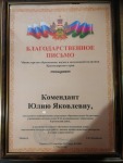Благодарственным письмом министерства образования, науки и молодежной политики Краснодарского края за достигнутые успехи в обучении и воспитании детей, многолетнюю плодотворную работу, высокое профессиональное мастерство награждена заведующая детским садом № 44 Комендант Юлия Яковлевна...